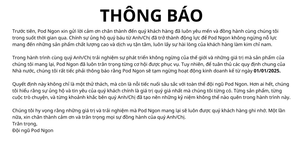 POD Ngon là đơn vị phân phối thuốc lá điện tử trực tuyến hàng đầu Việt Nam cung cấp thiêt bị Pod System, Vape, Mod Vape, tinh dầu và thuốc lá điện tử,… Chúng tôi miễn phí vận chuyển cho đơn hàng trên 1.000.000 VND, giao hàng trong ngày và dịch vụ miễn phí. Dịch vụ khách hàng hàng đầu trong ngành.