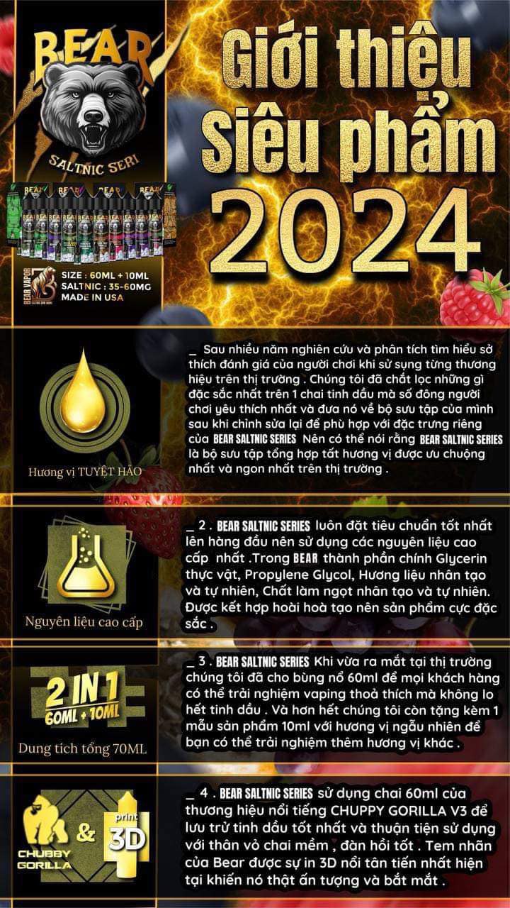 Bear Saltnic Series 60ML lần đầu tiên có mặt tại Việt Nam, đánh dấu một sự kiện quan trọng cho cộng đồng vaping trong nước. Sản phẩm này không chỉ cam kết mang lại chất lượng vượt trội mà còn hứa hẹn mang đến trải nghiệm đỉnh cao cho người sử dụng. Quá trình nghiên cứu và phát triển Bear Saltnic Series 60ML đã được thực hiện kỹ lưỡng để đảm bảo phù hợp với khẩu vị và sở thích của thị trường Việt Nam.