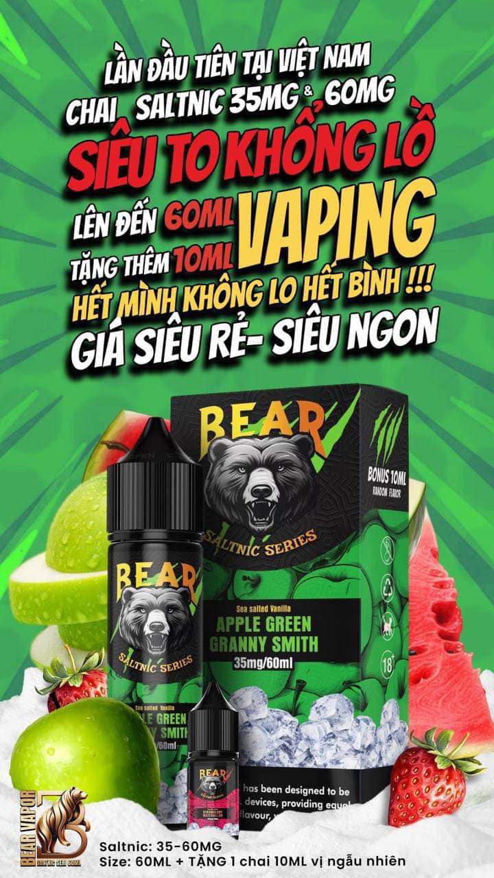 Bear Saltnic Series 60ML là dòng sản phẩm tinh dầu thuốc lá điện tử cao cấp mang thương hiệu Bear, với dung tích 60ML và lựa chọn nicotine 35MG hoặc 60MG. Xuất xứ từ Mỹ, Bear Saltnic Series 60ML không chỉ đảm bảo chất lượng vượt trội mà còn mang đến những hương vị tinh tế, độc đáo và đậm đà.